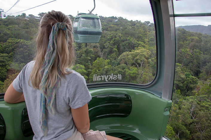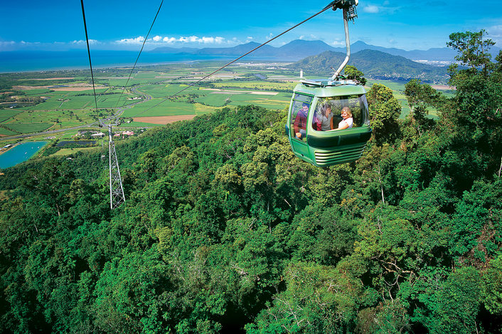 Enjoy a relaxing return to Cairns, travelling on the Skyrail Rainforest Cableway, just metres above the rainforest canopy.